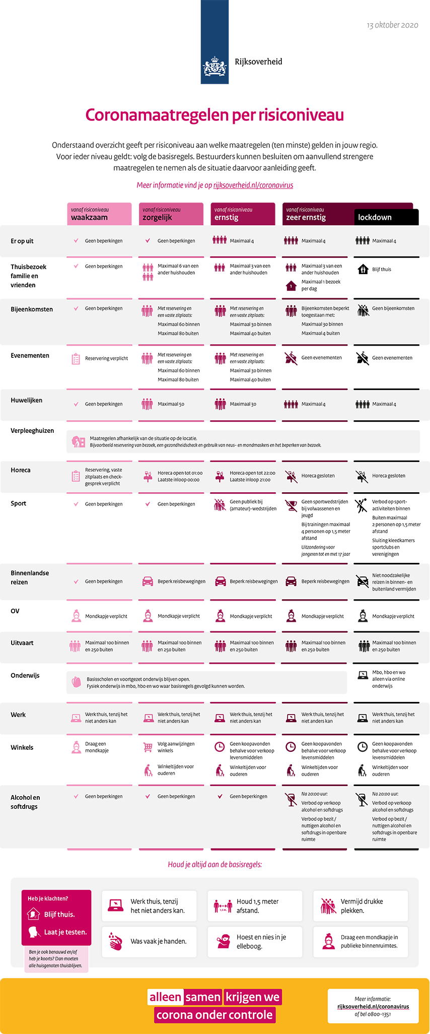 Meer dan we zouden willen heeft de verscherping van de maatregelen impact op de samenleving en de economie. Maar deze stap is nu nodig zodat zich daarna een nieuw perspectief aandient: een samenleving waarin we het virus onder controle houden. Het is cruciaal dat we 1,5 meter afstand tot anderen kunnen houden en de basisregels blijven volgen. Iedereen met klachten laat zich testen en mensen met een positieve testuitslag blijven thuis. Daarmee kan het allergrootste deel van de besmettingen worden voorkomen.