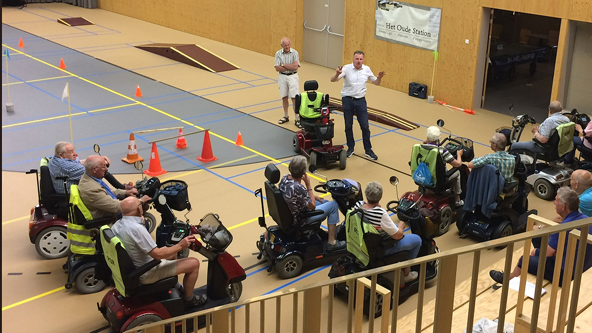De praktijkles wordt met de eigen scootmobiel of driewieler gevolgd.
