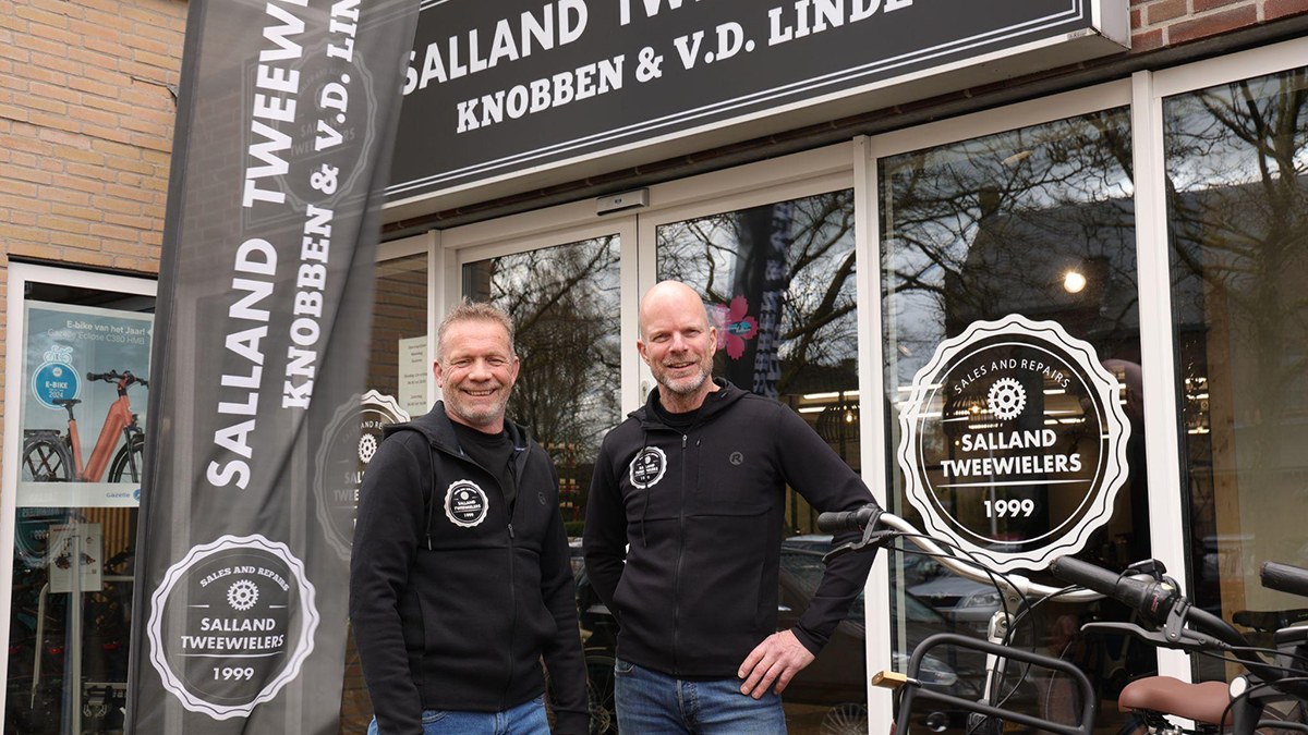 DALFSEN – Eind april 2024 bestaat de fietsenwinkel Salland Tweewielers van Jerry van der Linde en Marcel Knobben vijfentwintig jaar. Hoe vieren deze twee geboren en getogen Dalfsenaren dit heugelijke feit? Ze grinniken. “Een biertje en een patatje”. Dit past volledig bij de manier waarop zij hun feilloze reputatie hebben opgebouwd gedurende de kwart eeuw sinds 1999. Jerry: “Onze klanten blijven terugkomen omdat ze weten wat ze aan ons hebben. Het persoonlijke contact, het grapje en het grolletje, onze kennis van zaken. Verder doen we niks geks”.