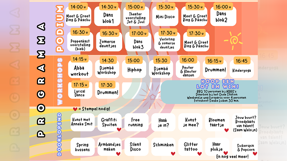De voorbereidingen zijn in volle gang: de kwasten van Anneke Smit worden uit het water gehaald voor schilderworkshops, terwijl de spuitbussen voor graffiti staan te popelen om prachtige kunstwerken te creëren. Jet en Juul doen vast een warming-up voor hun grote show, en de dansers van Studio Ses oefenen hun laatste danspasjes. Ook de freerunners van Zerofreerunning zijn bezig met hun spectaculaire salto’s.