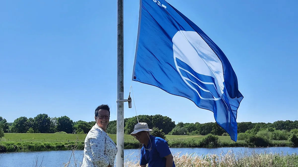 DALFSEN – Vanaf vandaag wappert er een speciale Blauwe Vlag in de haven van Dalfsen. Deze vlag staat symbool voor het internationale keurmerk voor jachthavens en stranden die de Dalfser haven heeft verdiend. De passantenhaven in Dalfsen is daarmee een van de 202 locaties die voldoet aan strenge eisen op het gebied van milieu, veiligheid en voorzieningen. Wethouder Betsy Ramerman hees de vlag op dinsdag 13 mei samen met havenmeester Haroet Baghdasarian.